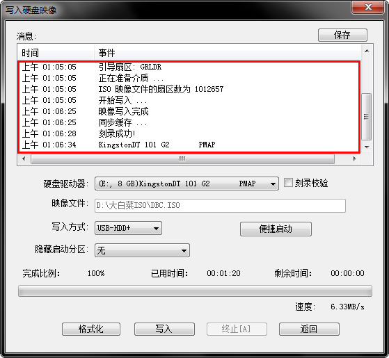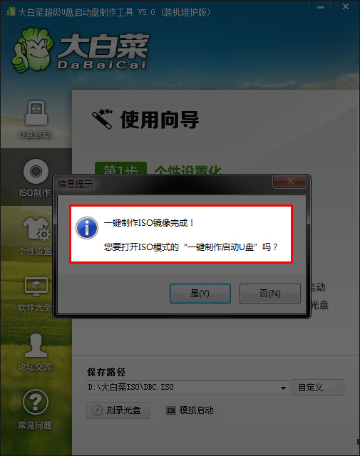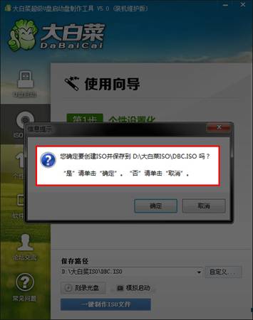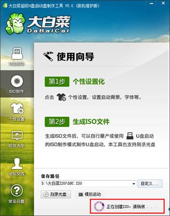 按鈕后程序會在“D:\大白菜ISO\”文件夾下創(chuàng)建DBC.ISO鏡像。