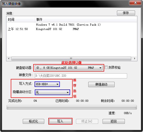 按鈕,按照圖中推薦選項進(jìn)行選擇,最后點擊寫入按鈕等待寫入完成。(如需刻錄光盤,點擊
