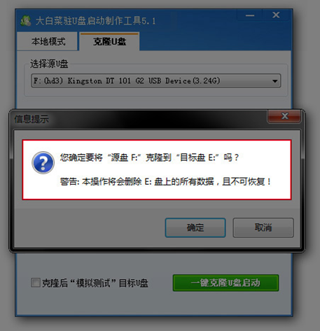 克隆U盤:U盤啟動制作完成后會在U盤自動生成一個大白菜駐U盤啟動制作工具,打開這個程序,大白菜駐U盤啟動制作工具本身也包含本地模式,切換到克隆U盤界面,選擇源磁盤和目標磁盤,確認目標U盤沒有重要數據后點擊一鍵克隆U盤啟動即可。