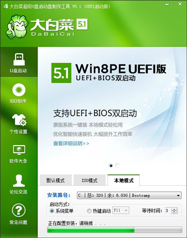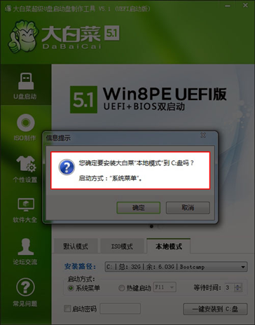 1、大白菜U盤啟動制作工具5.1以上版本的主程序都包含本地模式功能。切換到本地模式,選擇安裝路徑以及啟動方式。