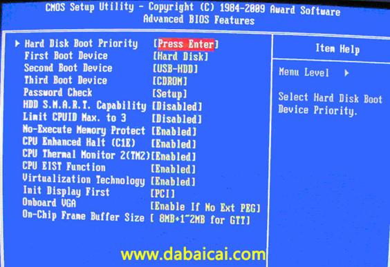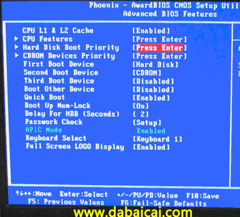 上圖2:高級BIOS設(shè)置(Advanced BIOS Features)界面,首先選擇硬盤啟動優(yōu)先級:Hard Disk Boot Priority
