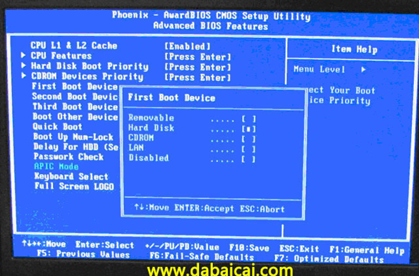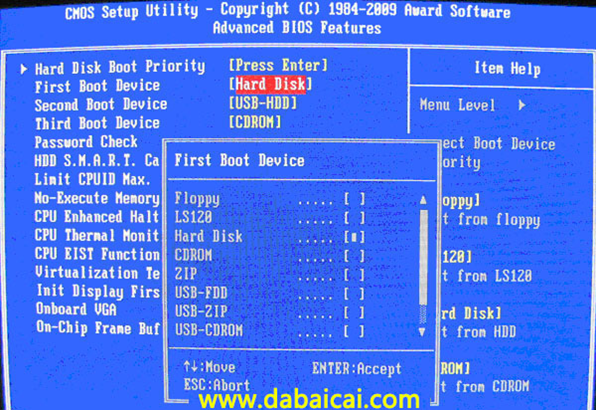 上圖4:再選擇第一啟動設(shè)備(First Boot Device):該版本的BIOS這里沒有U盤的“USB-HDD”、“USB-ZIP”之類的選項(xiàng),經(jīng)嘗試選擇移動設(shè)備“Removable”不能啟動,但選擇“Hard Disk”可以啟動電腦