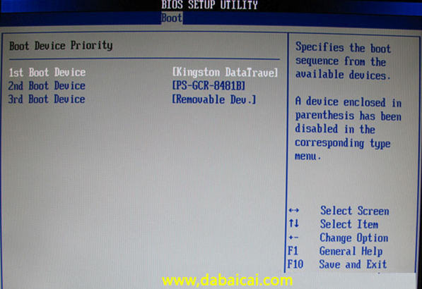 上圖2:啟動優(yōu)先級設(shè)備選擇(Boot Device Priority)在第一啟動設(shè)備(1st Boot Device)里選擇U盤