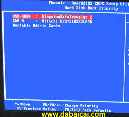 上圖3:硬盤啟動優(yōu)先級(Hard Disk Boot Priority)選擇:使用小鍵盤上的加減號“+、-”來選擇與移動設(shè)備,將U盤選擇在最上面。然后,按ESC鍵退出,回到圖2的設(shè)置界面。