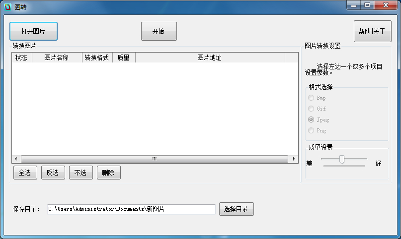 一款批量圖片(圖像)轉(zhuǎn)換器。支持Bmp、Gif、Jpeg、Png等格式,具有文件反選、質(zhì)量設(shè)置等功能。使用提示: