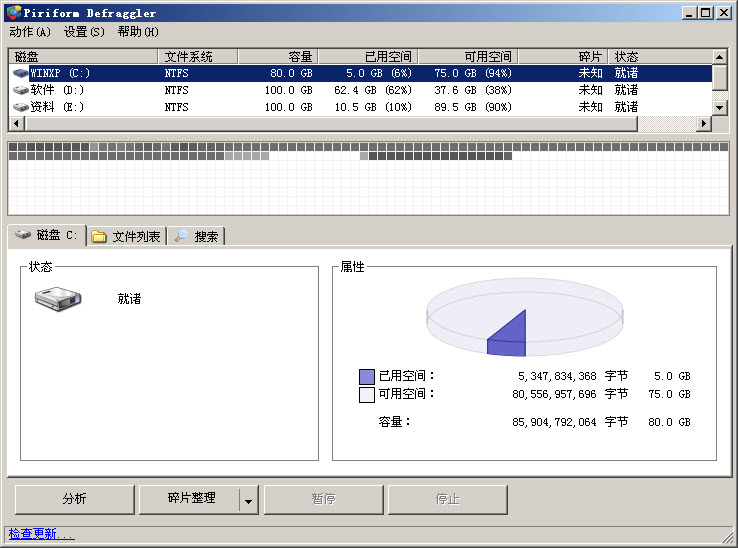 Defraggler的特色是:身材小巧(原程序1M多,經UPX壓縮后才600余K)、速度很快,并且還可以針對文件夾進行整理,比如,針對emule、迅雷等等的下載文件夾。