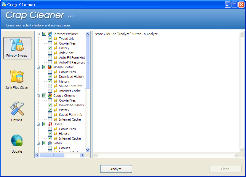 Crap Cleaner是一個(gè)100%免費(fèi)的系統(tǒng)優(yōu)化,隱私保護(hù)和清潔工具。有了它您會(huì)看到,性能立刻得到提高。它同時(shí)還可以擦掉你的活動(dòng)歷史和您的計(jì)算機(jī)上網(wǎng)痕跡,清理臨時(shí)文件及需要的硬盤空間。